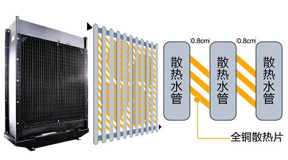 散热水箱 散热水箱主要作用为以水为介质交换柴油机内热量,达到降低机体温度的目的。 水箱由竖排列的一根根水管串联,间隙填充金属散热片。 国标每根水管的排列间隙为0.8CM,水管均采用金属制,符合国标,***不掺假。